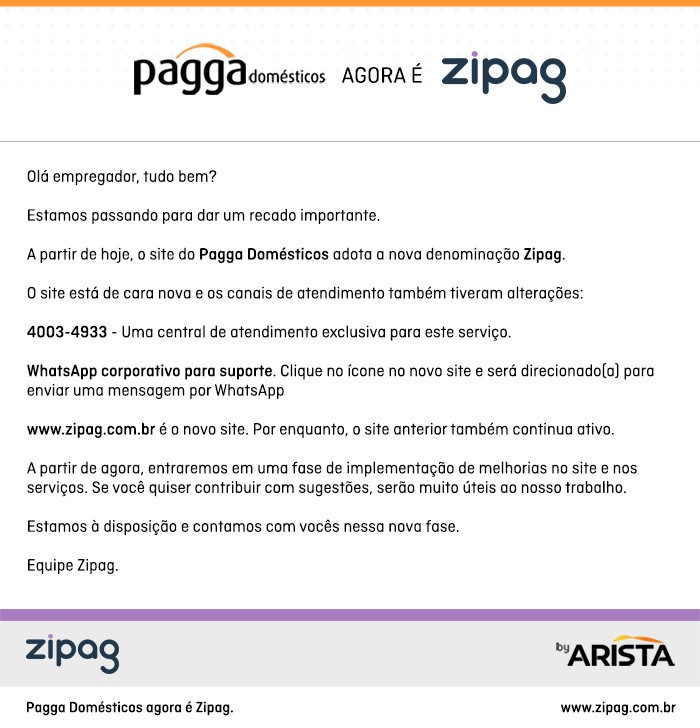 Basta cadastrar cada empregador no Zipag e inserir o código e senha de acesso de cada um ao eSocial. Os dados dos empregados domésticos ativos no eSocial passarão a ser sincronizados permanentemente com o Zipag. A partir daí, a folha passará a ser processada pelo Zipag e a guia DAE será gerada para recolhimento pelo empregador. A cada fechamento da folha, cada empregador poderá optar por emitir e pagar um boleto único contendo o valor da DAE, salários e benefícios. Nesse modelo, o Zipag fará os pagamentos e recolhimentos e disponibilizará os comprovantes autenticados na conta Zipag de cada empregador. Após cadastrar os empregadores no Zipag, o escritório contábil deve solicitar suporte ao atendimento para agrupar todos os empregadores em único login.